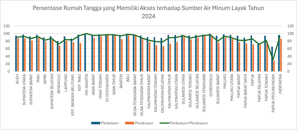 Sebanyak 92,64% rumah tangga telah memiliki akses terhadap sumber air bersih yang layak di Indonesia, dengan capaian tertinggi terjadi di DKI Jakarta 99,96% untuk wilayah perkotaan tanpa wilayah perdesaan dan capaian terendah yaitu provinsi Papua Pegunungan sebesar 30,64% dengan rincian 65,48% untuk wilayah perkotaan dan 27,89% untuk wilayah perdesaan. Hal ini menunjukan kesenjangan yang sangat jauh di setiap wilayah. Sedangkan proporsi dari populasi yang mendapatkan akses air minum secara layak adalah 20,49% untuk skala nasional.
